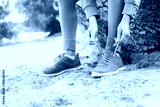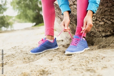 Unrecognizable young runner tying her shoelaces.On the beach.