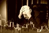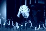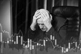Businessman is bankrupt. Man investor grabs head. Crisis chart near business owner. Sad manager sitting at office desk. Business man learned about bankruptcy of corporation. Trader became bankrupt