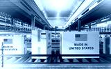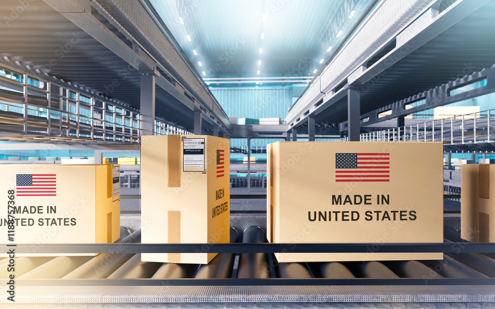 Made in united states. Boxes on conveyor. Production line with parcels. Products made in united states.. Parcels from USA at distribution center. Warehouse with American goods. 3d image