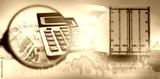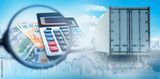 Money to pay for freight transportation. Calculator near moving truck. Logistics cost accounting concept. Money earned by logistics company. Freight transportation cost growth chart.