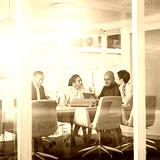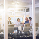 Corporate business meeting in modern office with glass walls, flare from the sunlight and reflections on the glass while business discussions take place amongst board members.