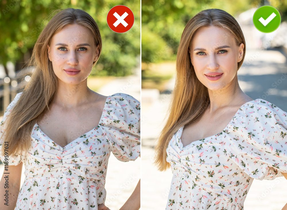 Collage two photos. Common mistakes in female posing and how to avoid them.