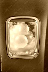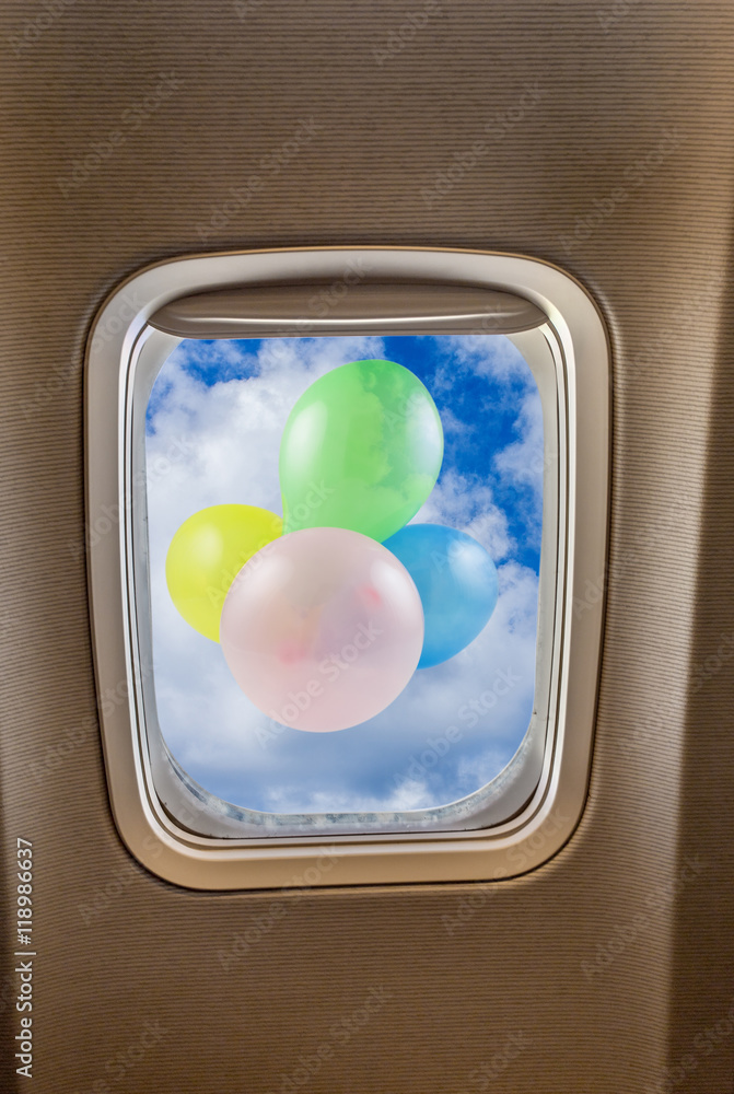 ballons vus à travers hublot d'un avion long-courrier, concept voyages de rêve, vacances