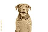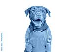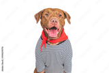 Stylish, lovable puppy and red neckerchief. Closeup, indoors. Studio shot, isolated, background. Elegant French style. Beauty and fashion concept