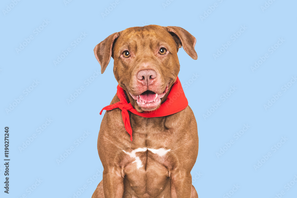 Stylish, lovable dog and red neckerchief. Closeup, indoors. Studio shot, isolated, background. Elegant French style. Beauty and fashion concept