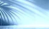 Minimalist simple background for design with beautiful light shadow from palm leaves on wall, gentle calm pastel muted shades of blue and beige with smooth color transition.