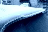 Heavy frost and ice crystals seen on the rear spoiler of a hybrid car seen after a severe ice storm in the UK. The car is parked on a private driveway just before defrosting.