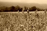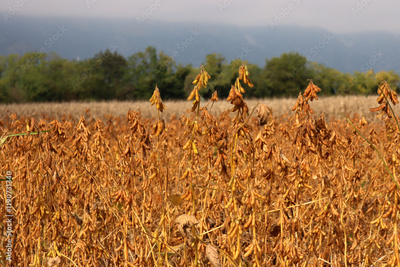 Close-up of dry Soybean field ready to harvest on a sunny day. Cultivated Glycine max