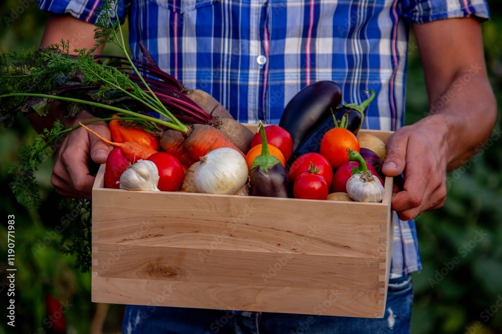 Farmer man holding vegetables in the garden. homegrown vegetables.