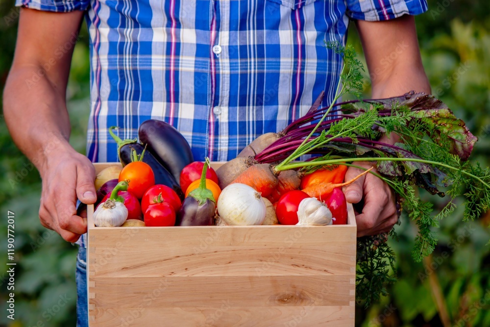 Farmer man holding vegetables in the garden. homegrown vegetables.