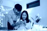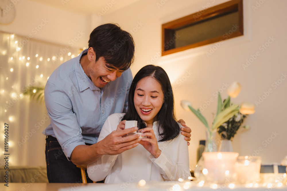 valentine, romance, diner, celebrate, romantic, affection, affectionate, hugging, loving, married. A man and woman are looking at a ring together. The man is smiling and the woman is also smiling.