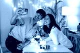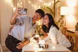 dining, romance, celebrating, celebrate, selfie, couple, affection, lover, loving, together. A man and woman are taking a selfie at a dinner table with wine glasses. Scene is happy and romantic.