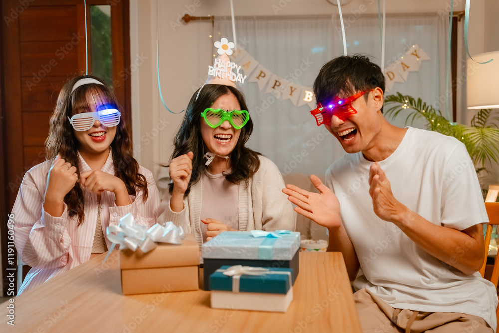 birthday, celebrate, colorful, party, present, treat, friends, surprise, festive, expression. Three people are laughing and wearing party glasses. They are gathered around a table with a presents.