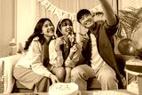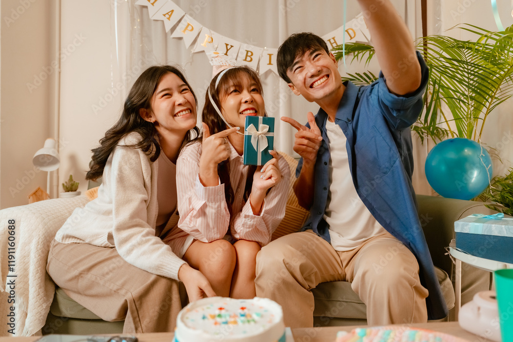 birthday, celebrate, colorful, party, present, treat, friends, surprise, festive, expression. A group of people are celebrating a birthday party. A man is taking a picture of the group.