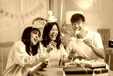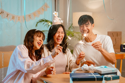 birthday, celebrate, colorful, party, present, treat, friends, surprise, festive, expression. Three people are celebrating a birthday party. A woman is holding a sparkler and smiling.