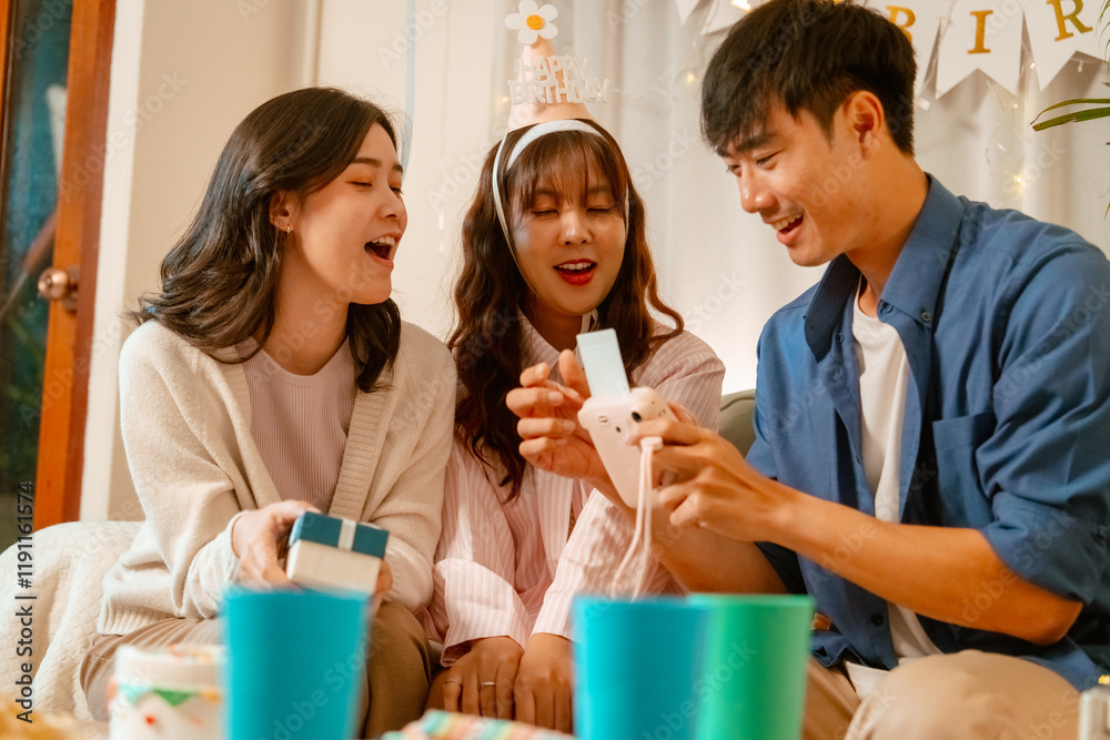 birthday, celebrate, colorful, party, present, treat, friends, surprise, festive, expression. Three people are sitting on a couch. They are smiling and seem to be enjoying themselves.