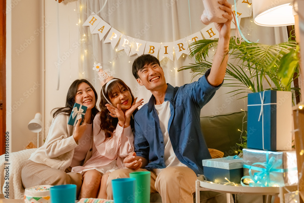 birthday, celebrate, colorful, party, present, treat, friends, surprise, festive, expression. A group of people are celebrating a birthday party. A man is taking a picture of the group with phone.