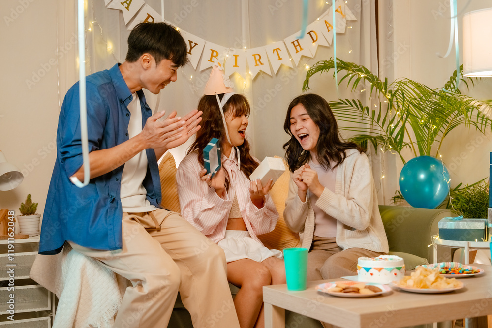 birthday, celebrate, colorful, party, present, treat, friends, surprise, festive, expression. A group of people are celebrating a birthday party. They are sitting and eating snacks while laughing.