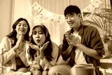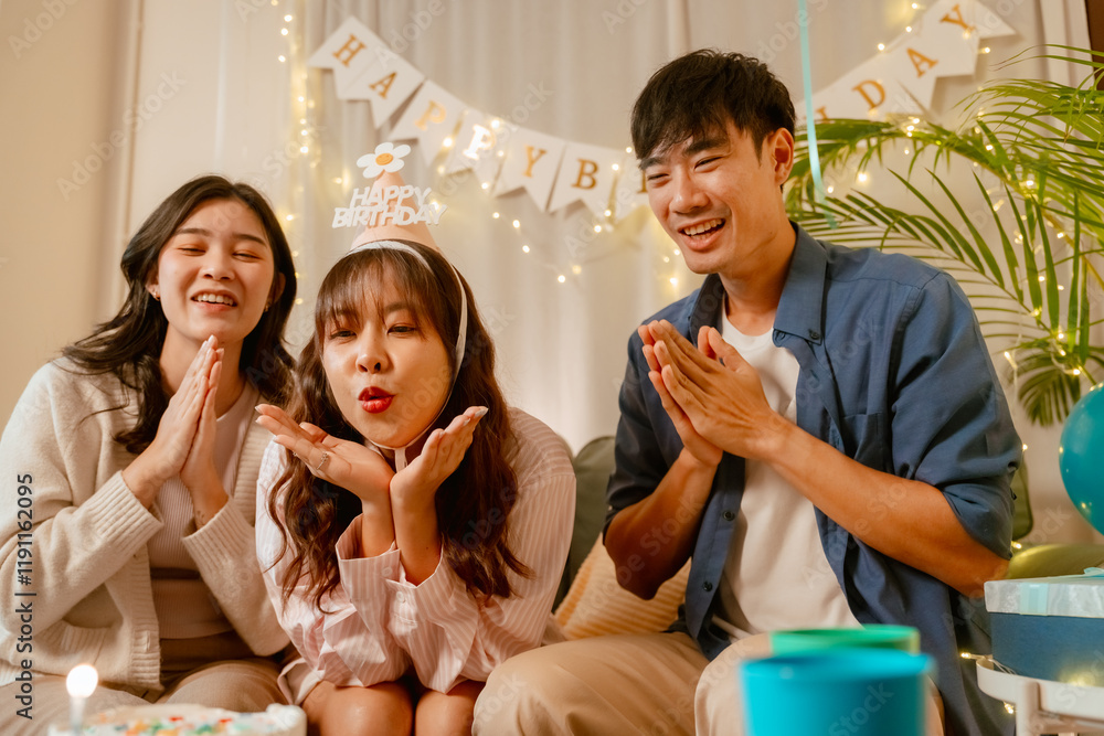 birthday, celebrate, colorful, party, present, treat, friends, surprise, festive, expression. A group of people are celebrating a birthday, with a banner Happy Birthday while the others are clapping.
