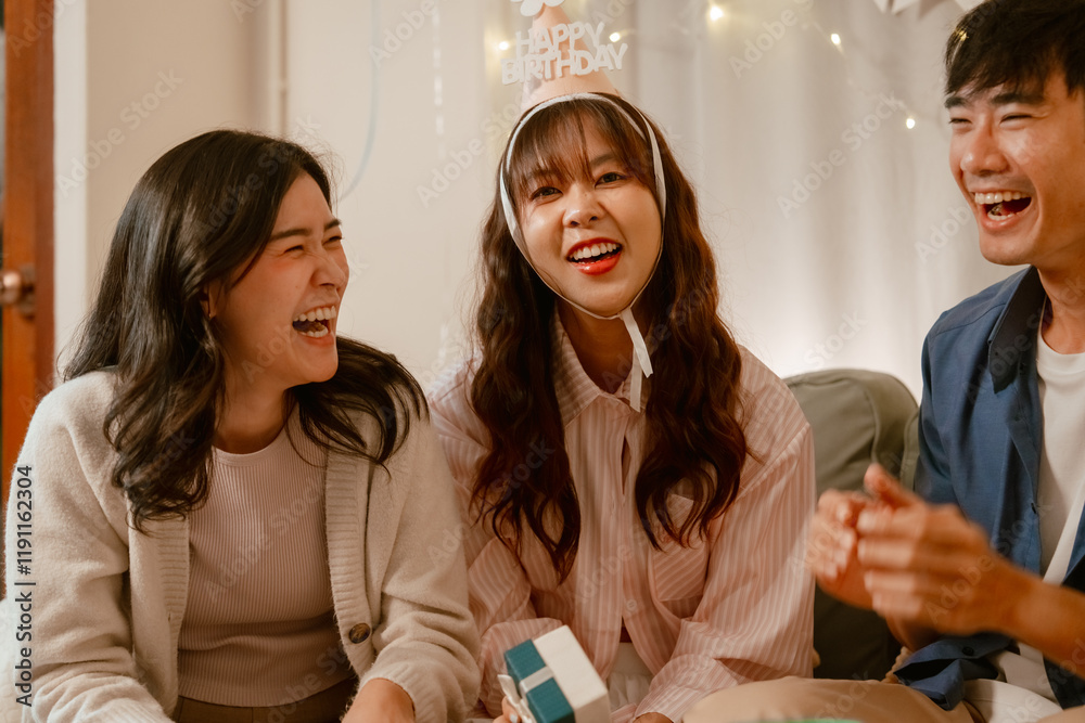 birthday, celebrate, colorful, party, present, treat, friends, surprise, festive, expression. Three people are sitting on a couch, laughing and smiling. One of them is wearing a birthday hat.