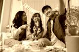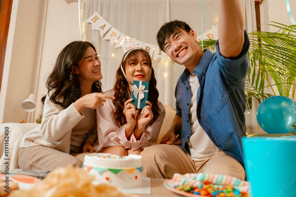 birthday, celebrate, colorful, party, present, treat, friends, surprise, festive, expression. A group of people are celebrating a birthday party. A woman is holding a gift and pointing to it.