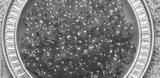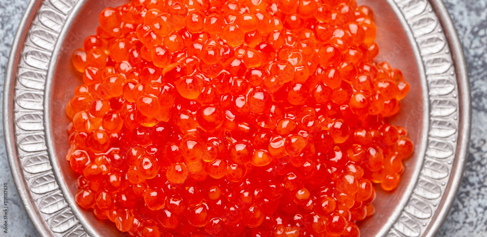 Small metal plate with red salmon caviar and a spoon top view on grey concrete background, festive luxury delicacy and appetizer.