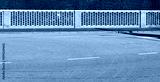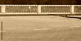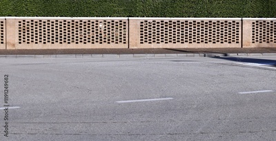 Fence made of pierced brick wall with hedge on top. Sidewalk and street in front. Background for copy space.