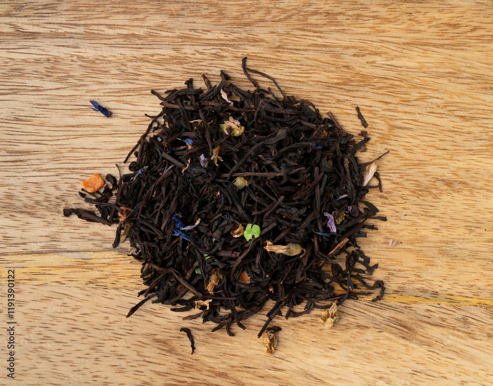 Flavored Black Tea Leaves Pile Texture, High Quality Black Tea Pile with Fruits and Flowers, Dry Tea Leaves
