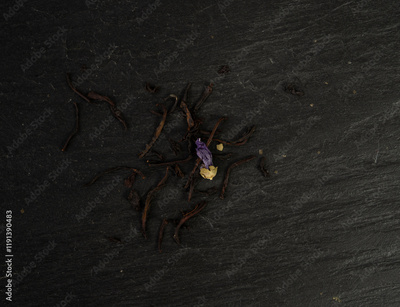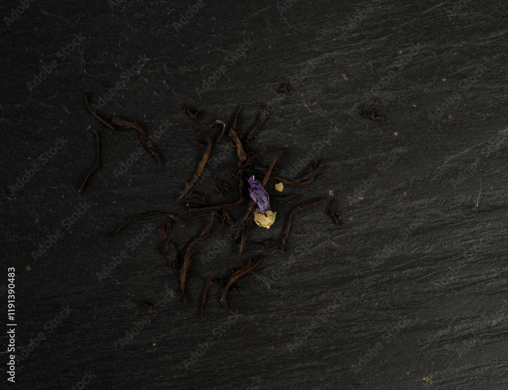 Flavored Black Tea Leaves Pile Texture, High Quality Black Tea Pile with Fruits and Flowers, Dry Tea Leaves