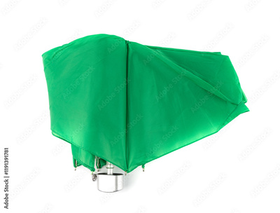 Compact folded umbrella isolated, small green parasol, old umbrella