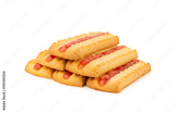 Shortbread sticks with a jam strip isolated, biscuit cookies with fruit marmalade or jelly on white