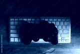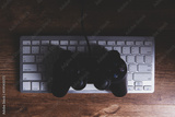 close up view of a computer keyboard and mouse with a black joystick