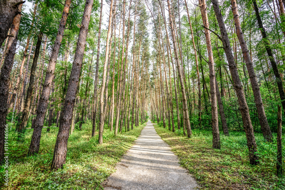 Pine green forest background in a sunny day.