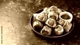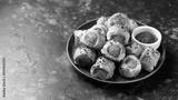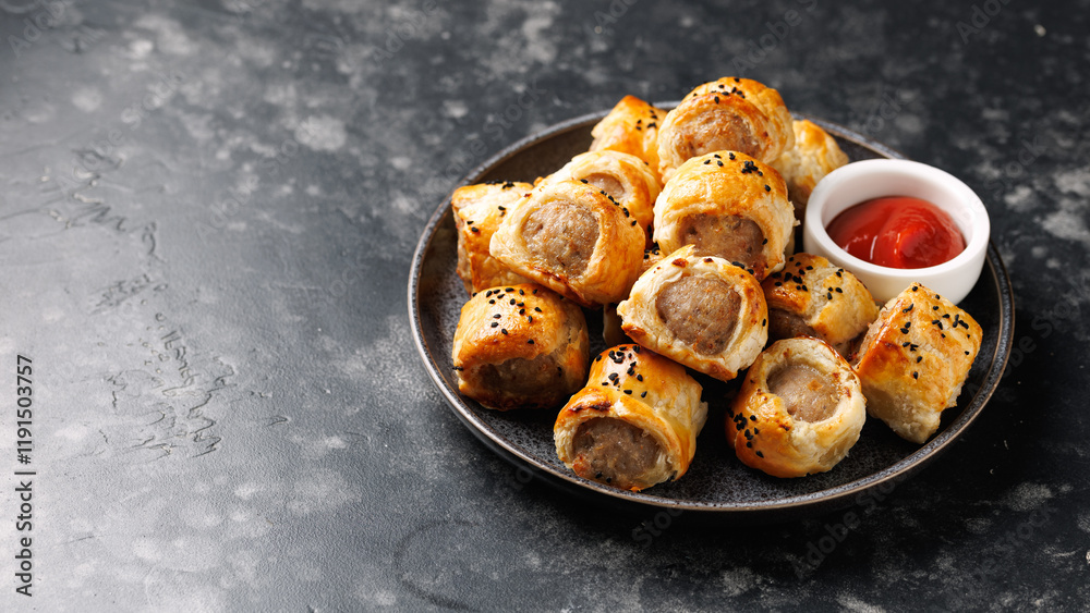 Freshly baked English Sausage rolls with ketchup. Party snack food.