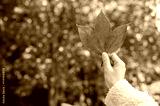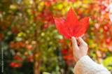 Someone hand holding red maple leaf after falling from tree. The maple leaf is Canada's national and arboreal symbol.