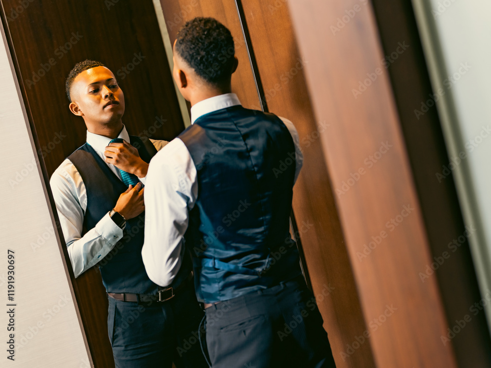 man, mirror, businessman, changing clothes, business, suit, formal, foreigner, black, global, men's clothing, businessperson, people, tie, cleanliness, luxury, full-length mirror, three-piece suit, co