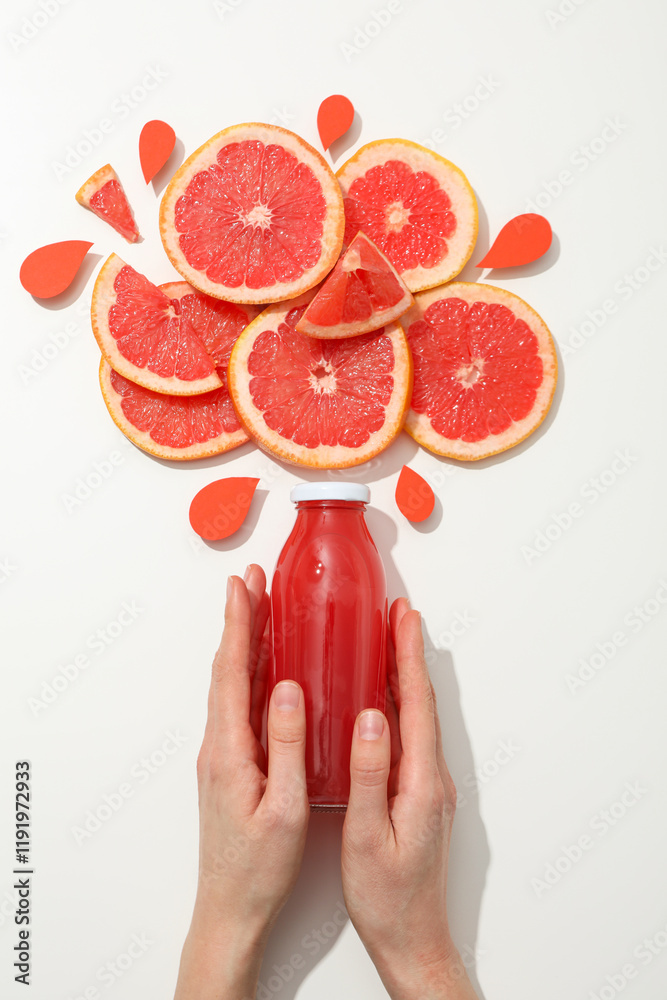 Grapefruit slices and bottle of juice in female hands on white background, top view