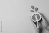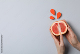 Half of grapefruit in female hands and paper drops on gray background, space for text