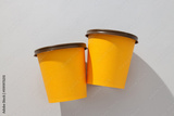 Yellow paper cups with lids on a light background