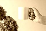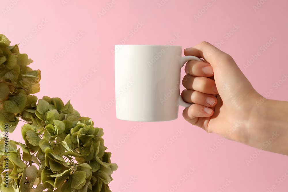 White cups with green hydrangeas in a vase