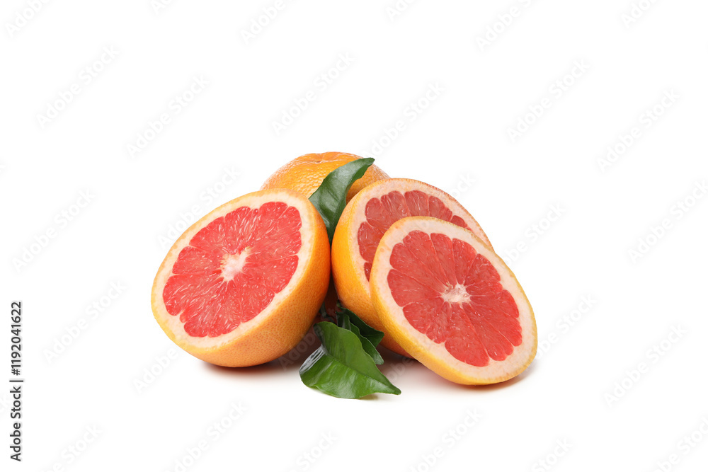 PNG, Ripe sliced grapefruits and leaves, isolated on white background