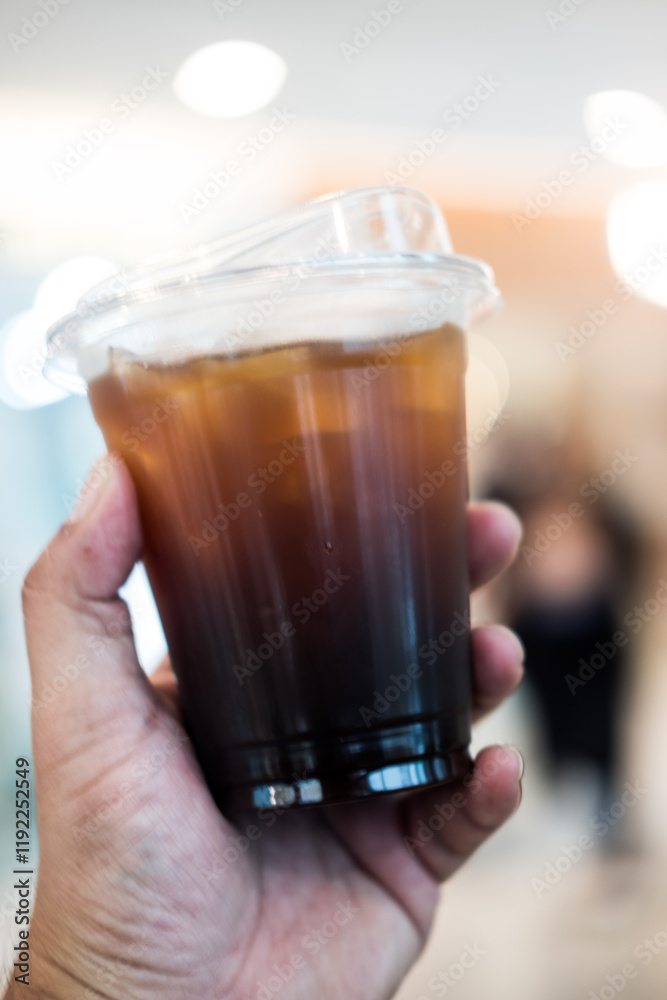 Transparent plastic cup mockup with a lid, and an iced Americano in hand