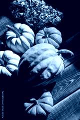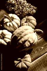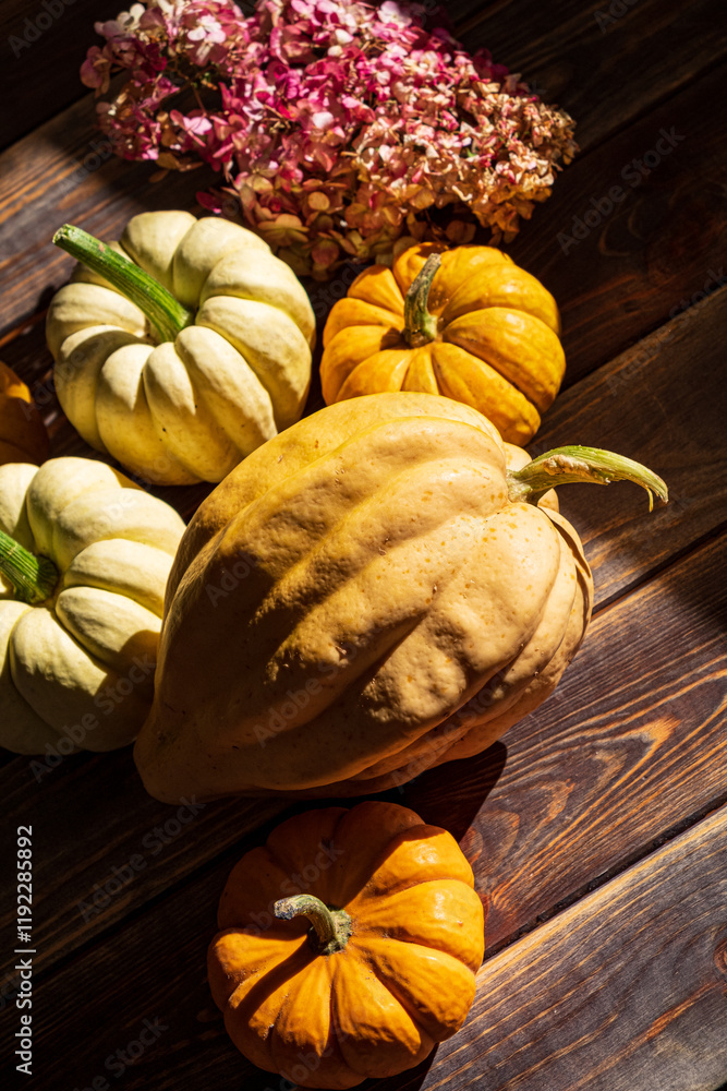 Pumpkins on dark wooden background. Halloween harvesting thanksgiving concept