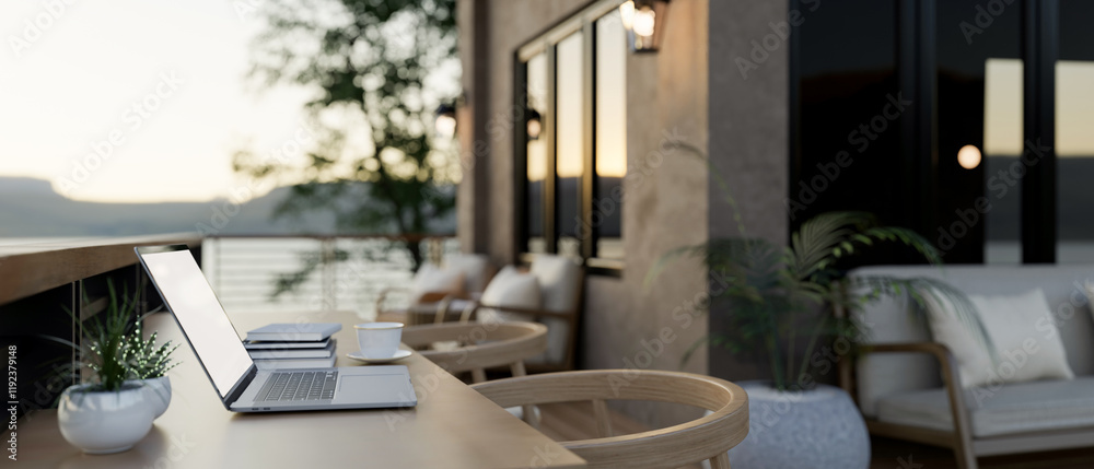 A side view of a laptop on a wooden table on a cozy contemporary home balcony, with a nature view.