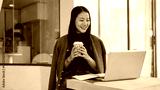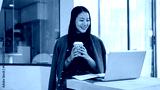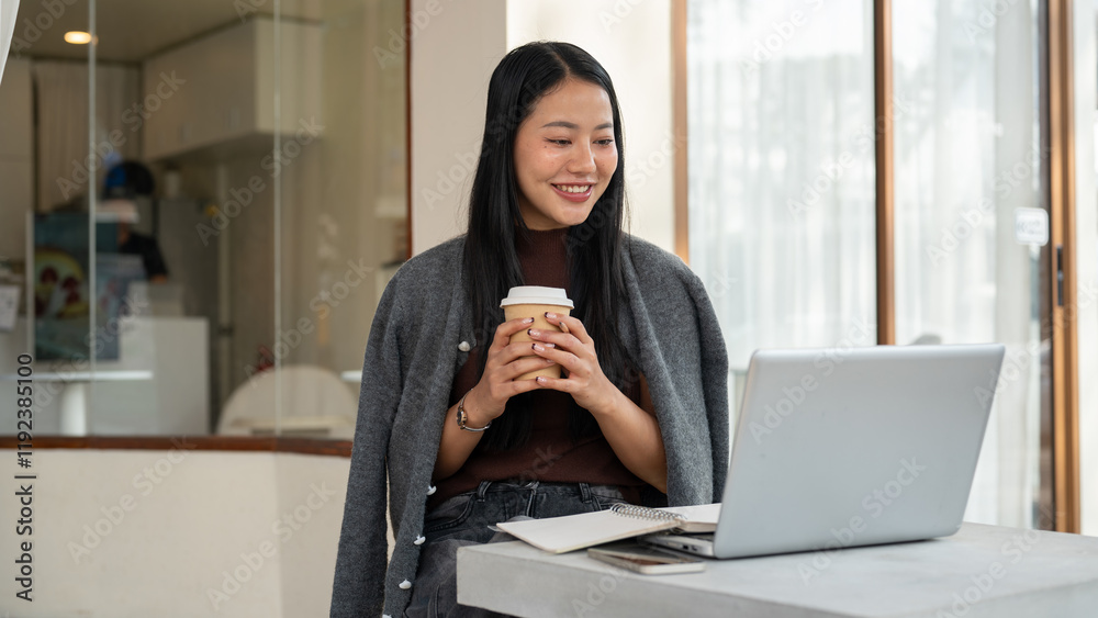 A woman working remotely from a cafe, focused on reading on laptop while enjoying a hot drink.