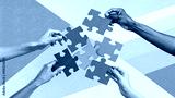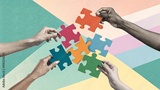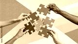 Abstract, modern art collage of human hands assembling a colorful puzzle