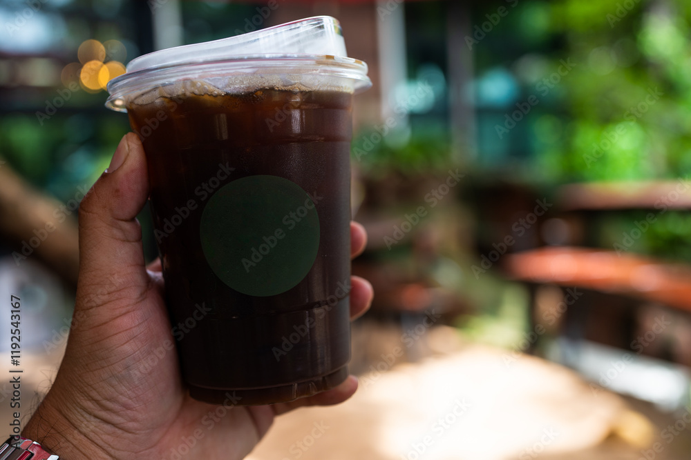 Ice Americano black coffee on man hand