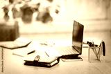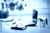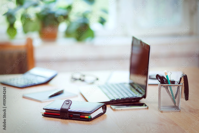Office workplace with laptop and smart phone on wood table