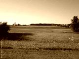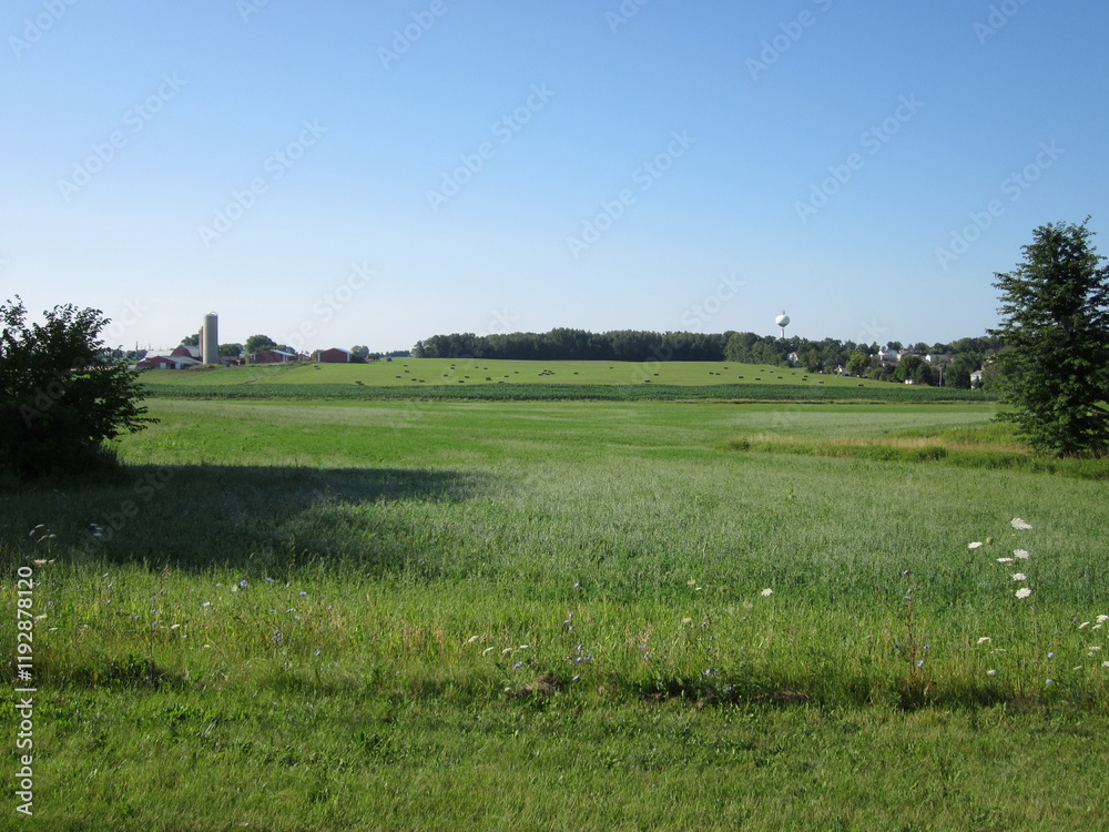 Wide view of a far away distant farm, on the horizon, across a green field.