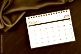 August 2025 Monthly desk calendar with red silk on black leather background.